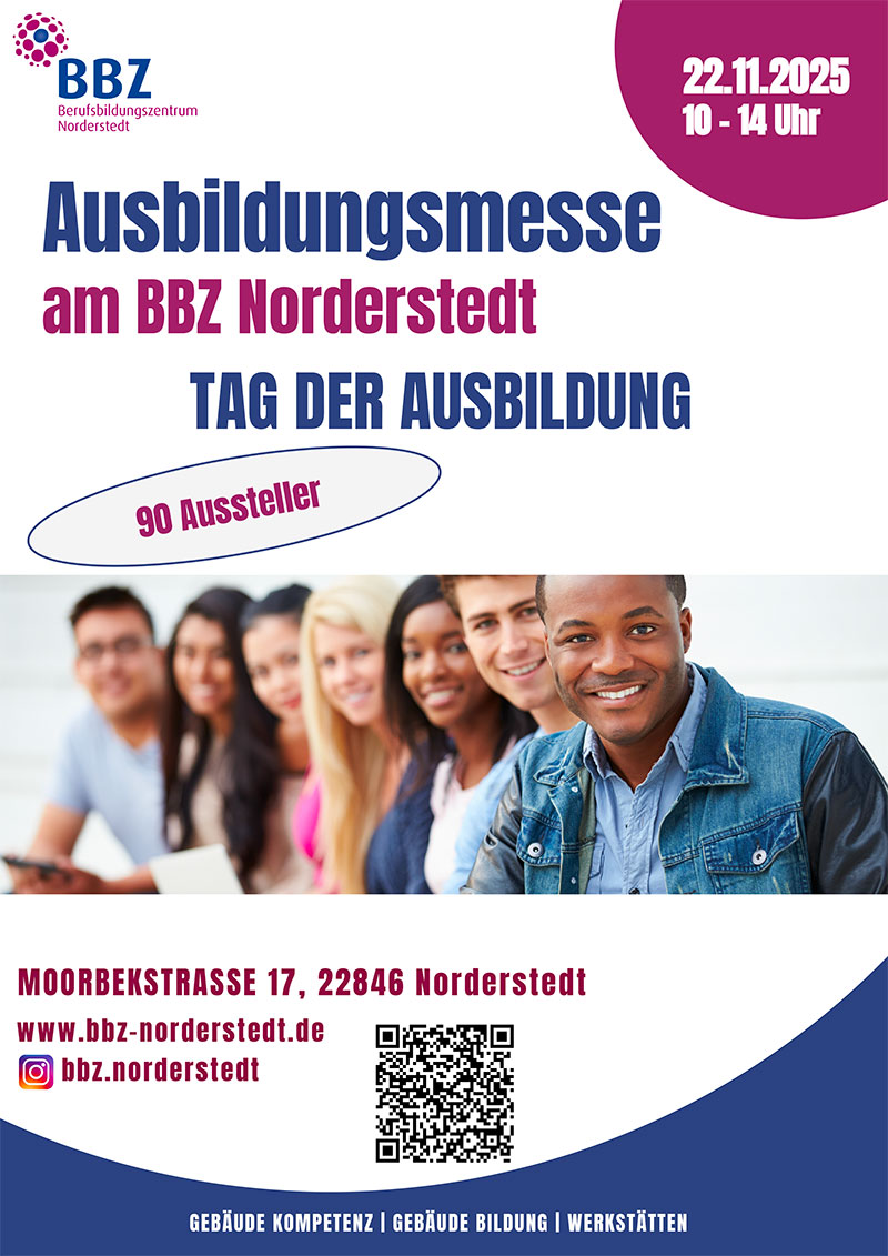 Komm' zur Ausbildungsmesse am 22.11.2025 ins BBZ Norderstedt und lerne uns und zahlreiche weitere Ausbildungsberufe aus der Nähe kennen!