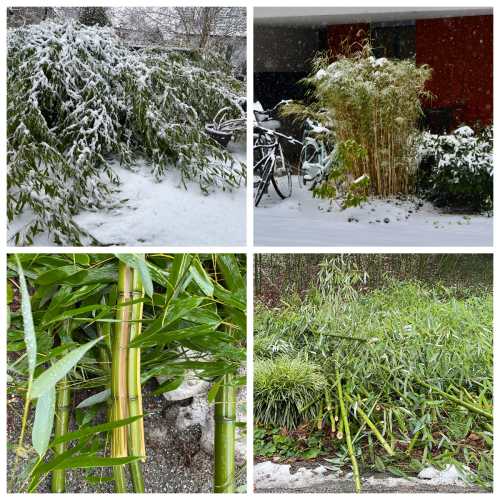 Bambushalme sind unerhört biegsam. Bei Schneelast lagern die Halme insbesondere der hohen Sorten, einzelne Halme können jedoch auch brechen. Hier werden Bambus im Botanischen Garten Hamburg nach Schneelast ausgeputzt und abgeknickte Halme abgeschnitten. Bild oben rechts: Die niedrigeren Fargesia-Sorten können mit Blick auf Standfestigkeit bei Schneelast und das leidige Thema der Wurzelsperre gegenüber Phyllostachys-Sorten die bessere Wahl sein