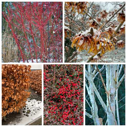 Klassiker und Preziosen im winterlichen Garten (von oben rechts im Uhrzeigersinn): Cornus alba 'Sibirica' (Rotrindiger Hartriegel), Hamamelis x intermedia 'Diane' (Zaubernuss), Betula jacqueontii (Himalaja-Birke), Cotoneaster-dammeri-Sorte (Zwerg-Kriechmispel) und das langhaftende, kupferfarben verfärbte Laub der Rot-Buchen (Fagus sylvatica) - fehlt nur noch ein Schuss Immergrün in Form von Taxus (Eibe) oder meinetwegen auch Rhododendron ... und wo bleiben die Gräser?