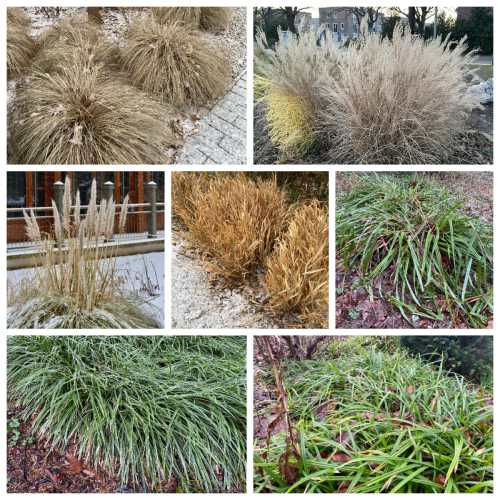 -      Panicum virgatum in Sorten (Rutenhirse): Hier sind Unterschiede je nach Standort und Sorte zu beobachten: Feinhalmige Sorten mit straffen Stängeln wie ‘Strictum‘ stehen noch aufrecht und gehören in die Gruppe 3 mit guter Winterstruktur, während andere Sorten wie ‘Külsenmoor‘ (oben im Bild untere Reihe links) als Gräserschopf geknickt niederliegend