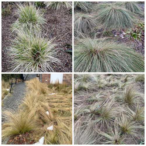 -      Stipa tenuissima, Stipa ‘Pony Tails‘ (Federgras): Federgräser zählen zu den Gräsern, die normalerweise nicht zurückgeschnitten werden. Flächig gepflanzt wirken die Flächen durch einzelne platt gedrückte Pflanzen nach Schneelast zwar etwas durcheinander – insgesamt bietet dieses Gras aber durchaus eine noch akzeptable winterliche Struktur