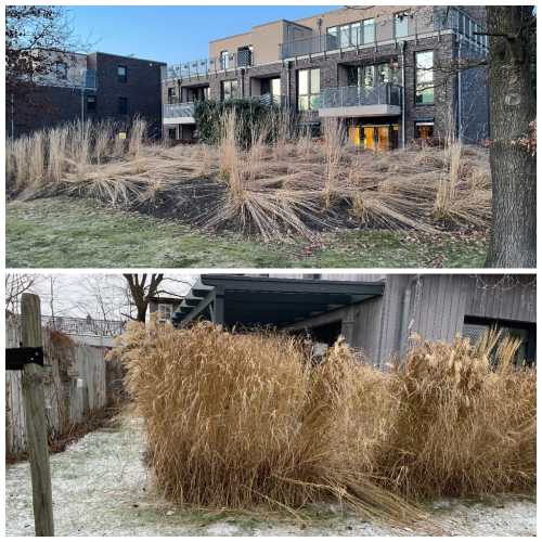 Im Bildbeispiel oben wurden Calamagrostis großflächig als Gräserhecke auf einen Erdwall gepflanzt, um den Einblick in die dahinterliegenden Gärten und Wohnzimmer zu verringern: Diese Funktion kann nun nach Schneefall für den Rest des Winters nicht mehr erfüllt werden.