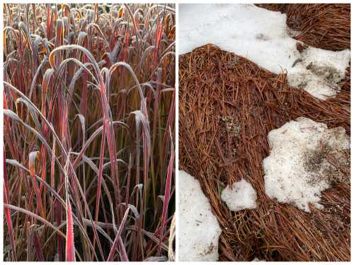 Das Japanische Blutgras (Imperata cylindrica ‘Red Baron‘) besticht noch im späten Herbst mit bereiften Blättern und hat die in Norddeutschland letzten milden Wintern überlebt. Ob da aus dem Mulchhaufen (Bild rechts) in diesem Frühjahr irgendetwas austreiben wird?