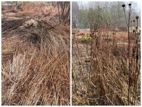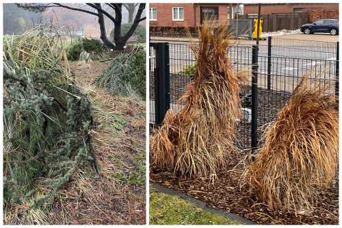 Bild links: Winterschutz der Horste von Cortaderia selloana mit Reisig im Botanischen Garten Hamburg, Bild rechts: Zusammengebundenes Chinaschilf oder doch ein Langhaarmonster im Regen?