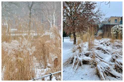vertragen Schneelast und Winternässe nicht gleichermaßen gut und quittieren Schneelast unterschiedlich (Bild links: Strukturstark auch nach mehreren Schnee-Tau-Perioden: Chinaschilfe (Miscanthus) sowie im Hintergrund Schilfgras (Phragmites); Bild rechts: Gräsermikado bei einer flächigen Pflanzung von Calamagrostis x acutiflora 'Karl Foerster')